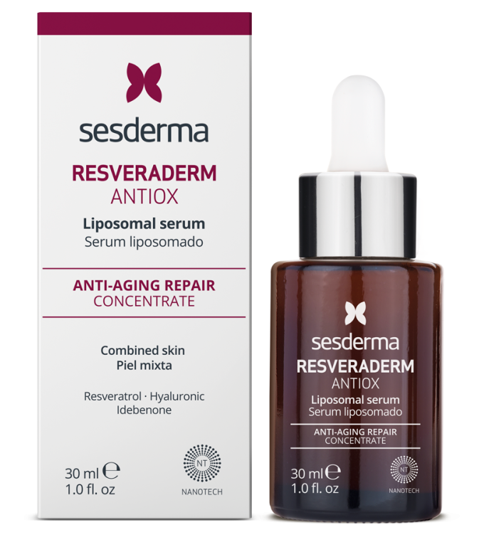 Антиоксидантная липосомальная сыворотка, в состав которой входит ресвератрол, липосомированная гиалуроновая кислота и стволовые клетки синеголовника приморского, увлажняет, восстанавливает, защищает кожу с первыми признаками старения.